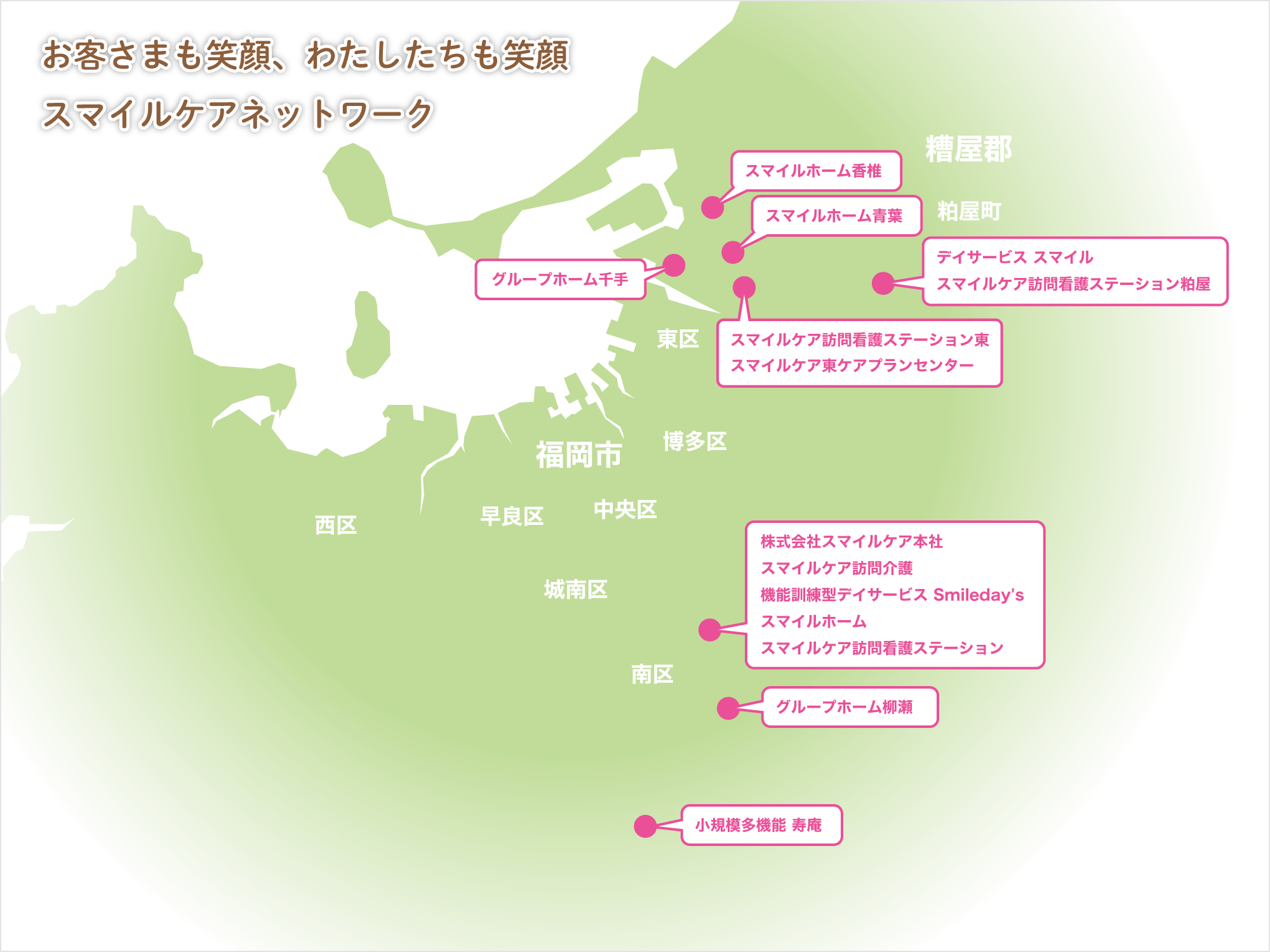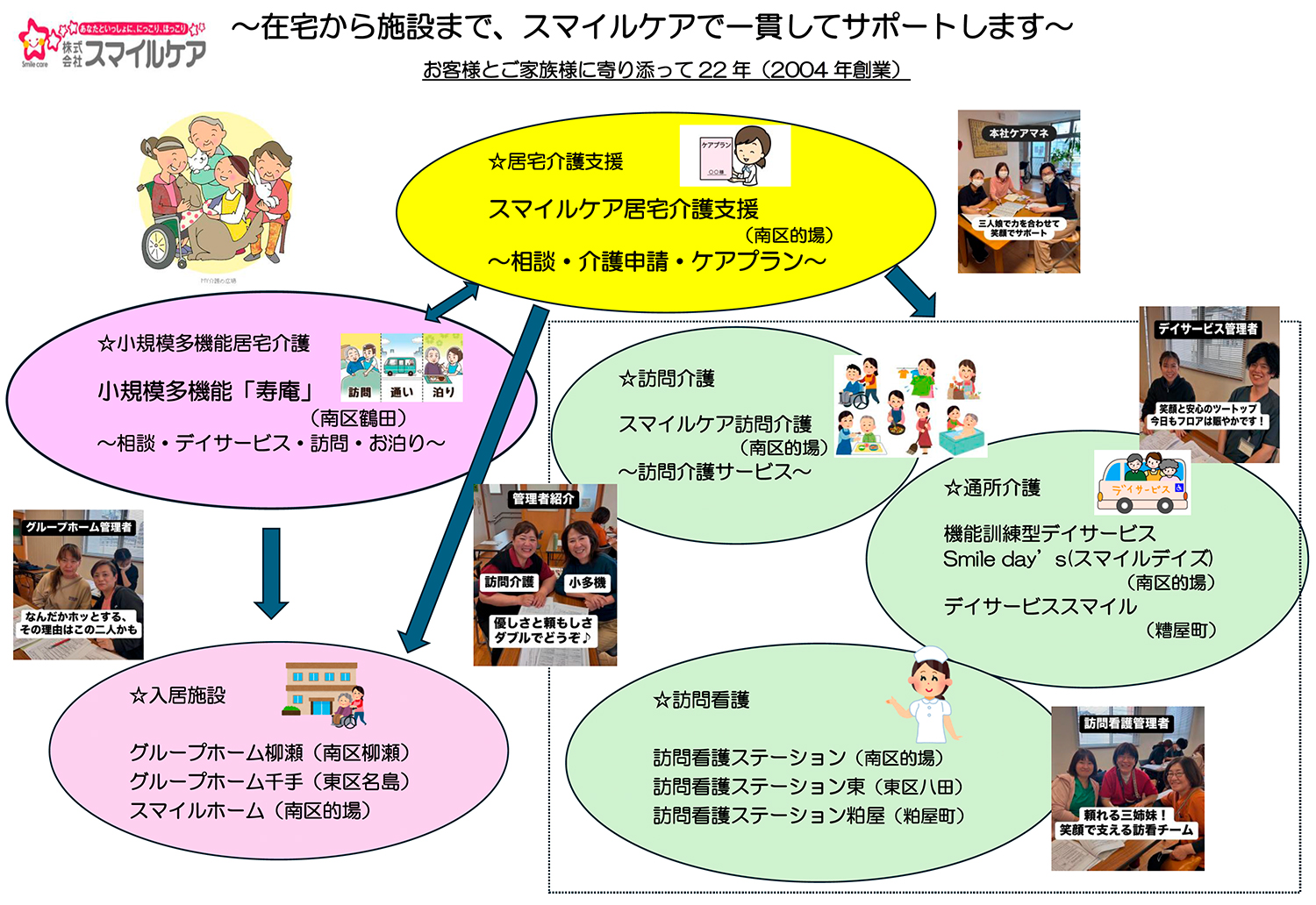 これからも私どもは、利他の精神で、お客様の要望に真摯に耳を傾けながら、スマイルケアの職員に「出会えて良かった」と言われるサービスを皆様方に提供できるよう精進してまいる所存でございます。